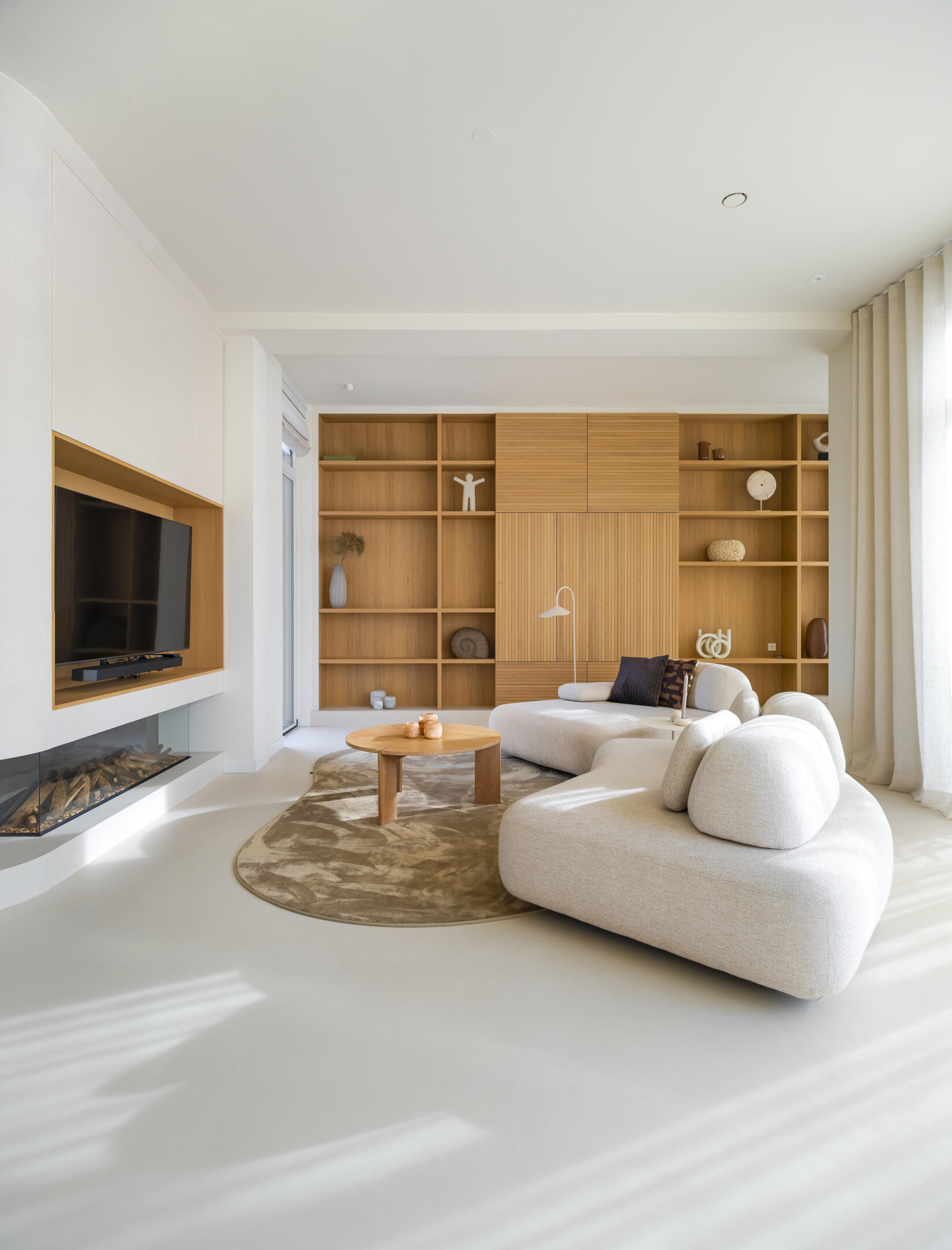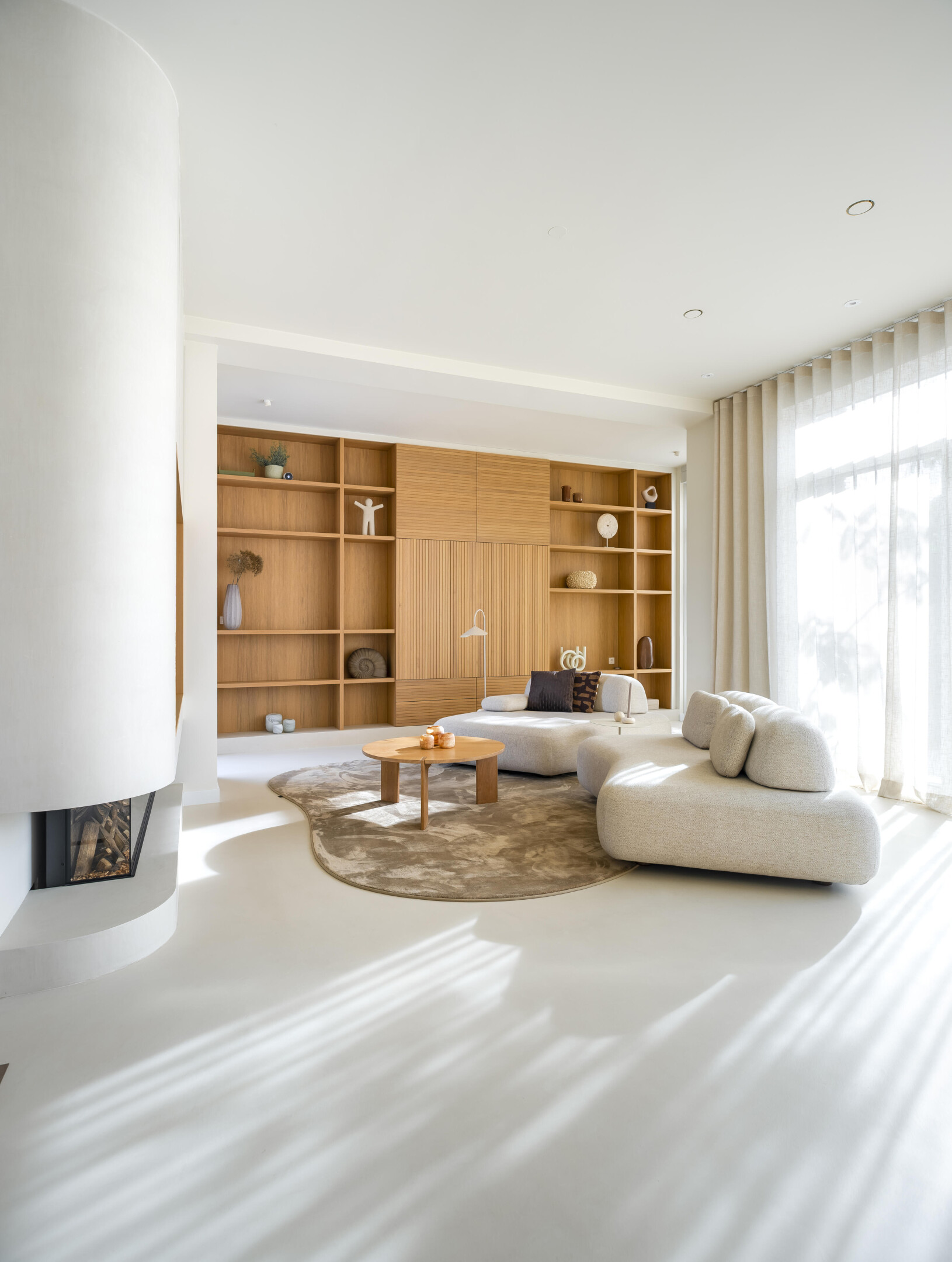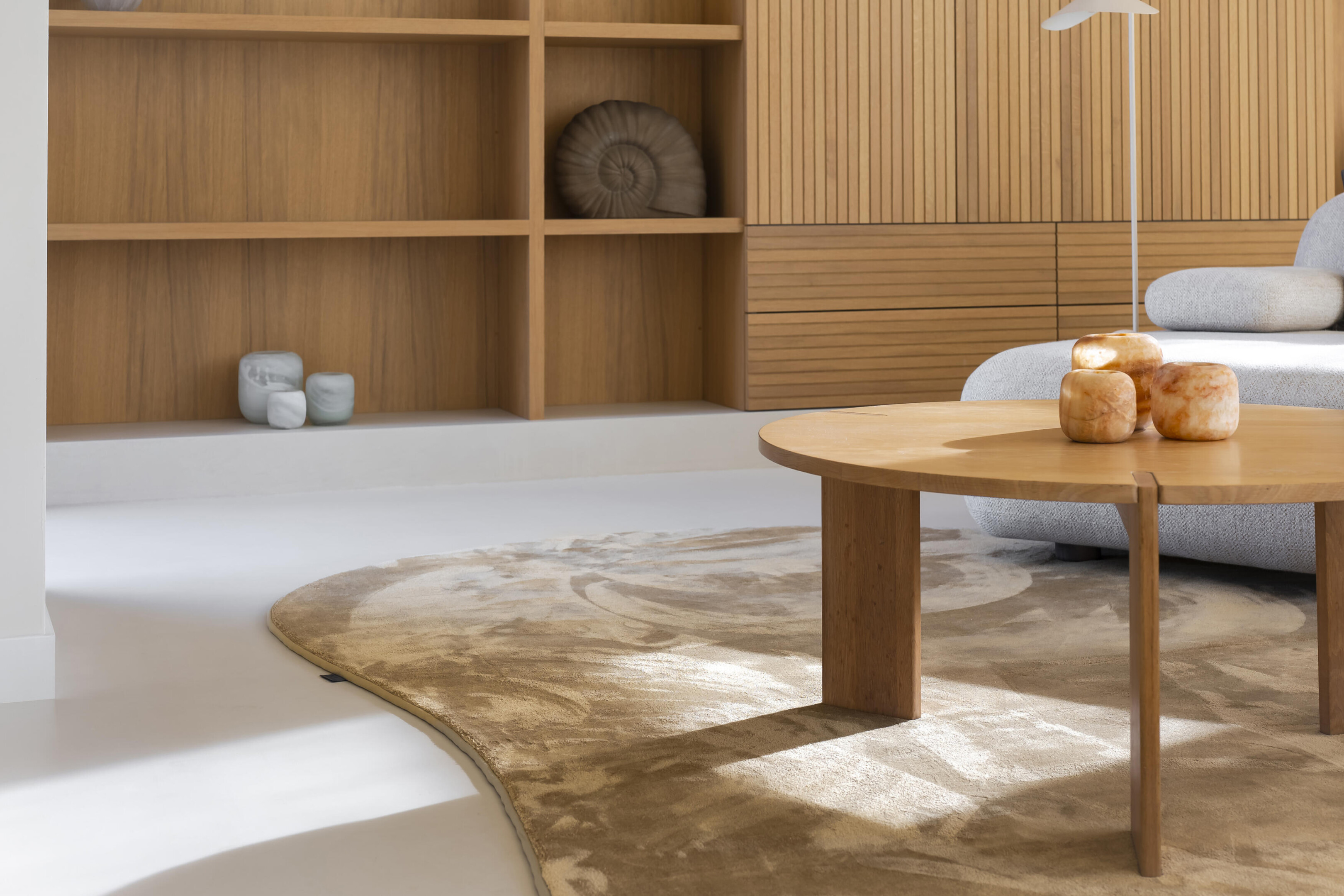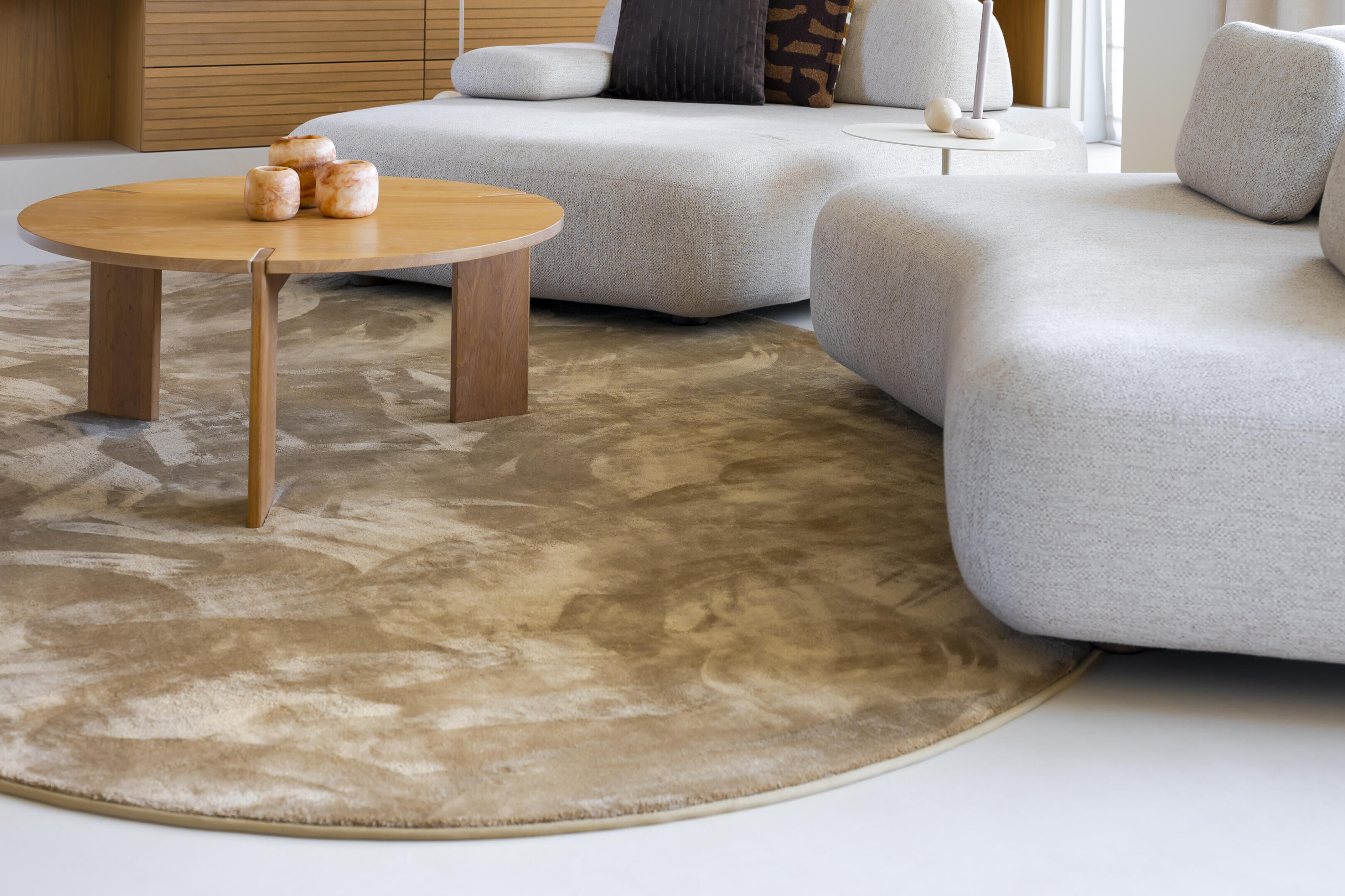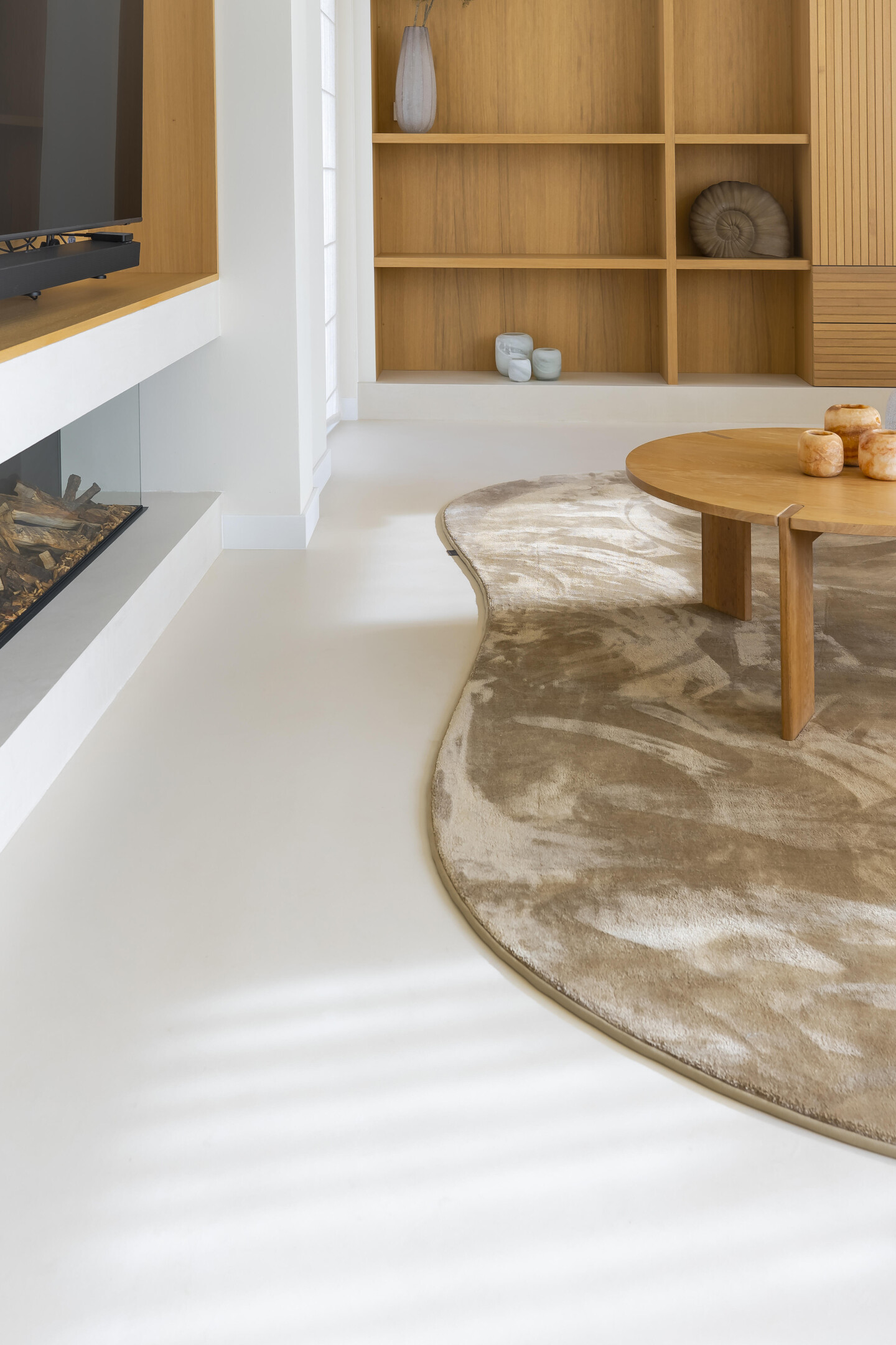 Dit karpet kenmerkt zich door een fijne, gelijkmatige structuur en een organische vorm. Het is vervaardigd in ons Atelier en afgewerkt met een matchende blind bandering. In het lichte interieur sluit de neutrale tint vanzelfsprekend aan bij de gebruikte kleuren en materialen.