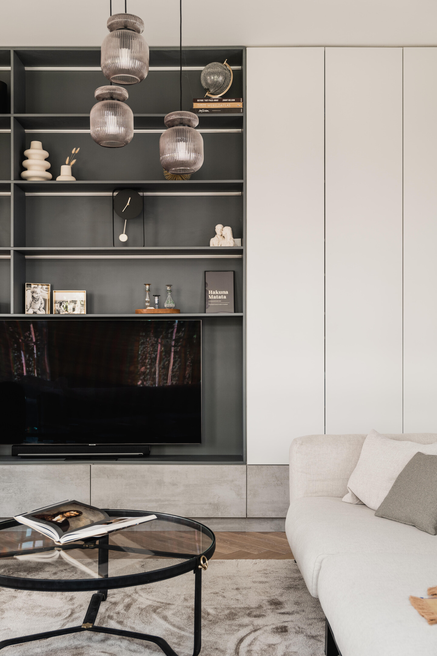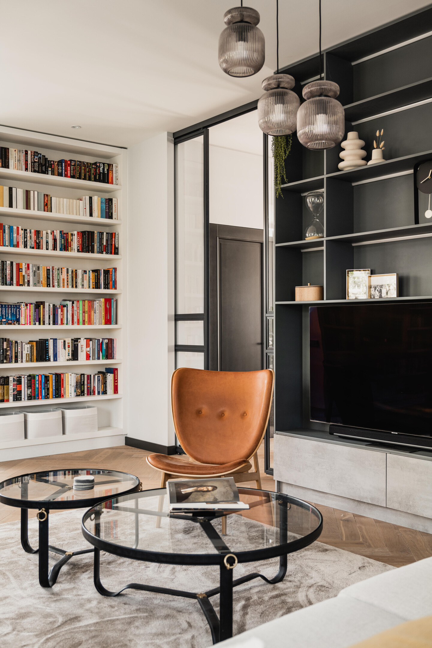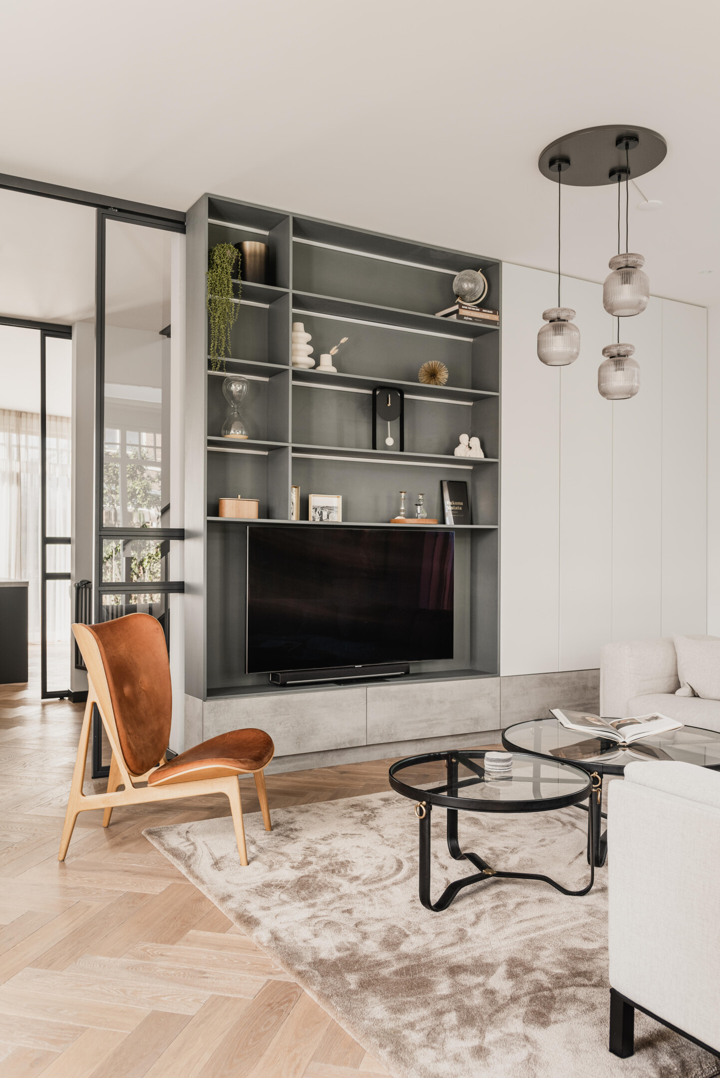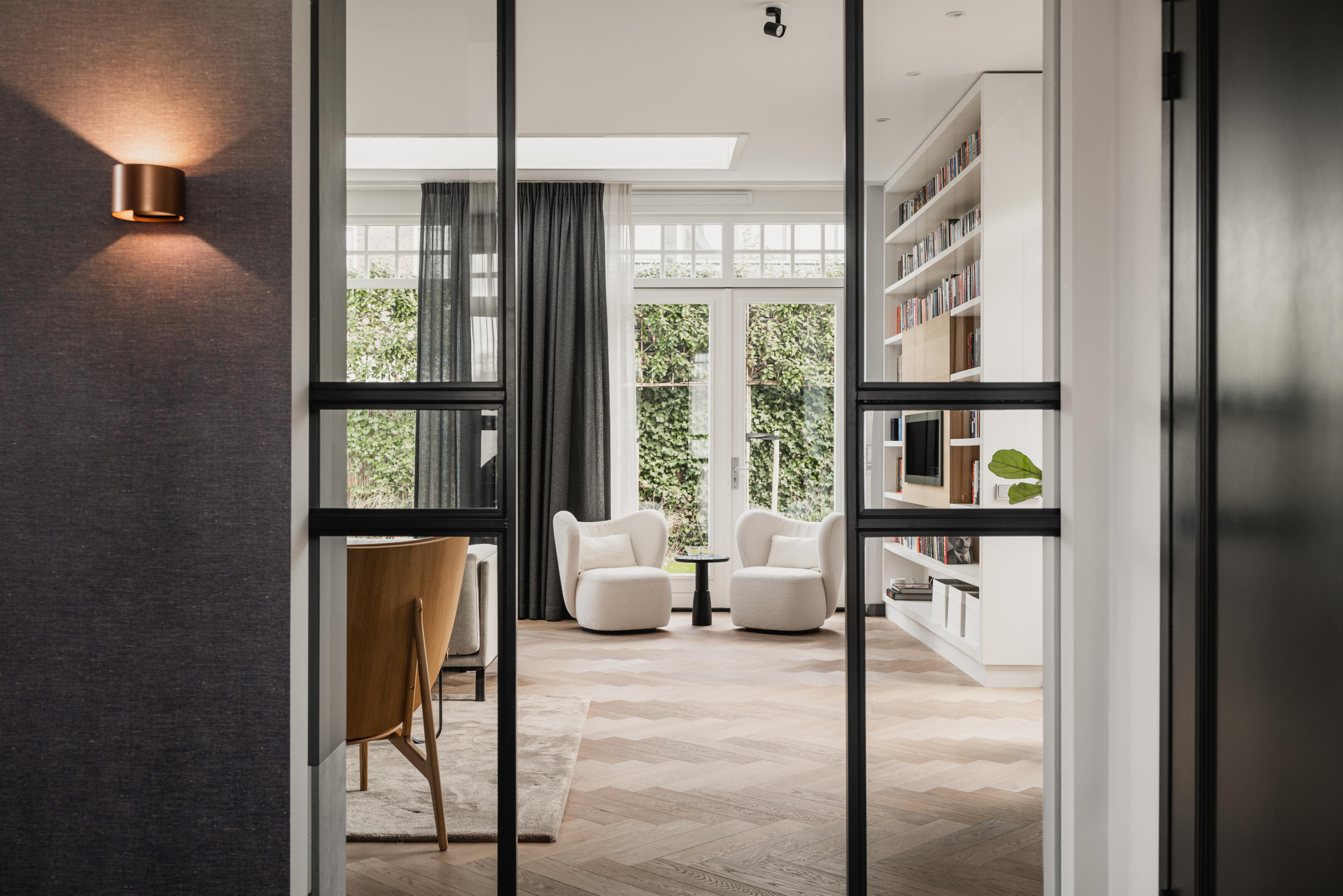 Een grote leefkeuken en warme ruimtes waren wensen van de klant, deze zijn perfect verwerkt in dit totaalontwerp. De wisselwerking tussen donkere en lichte kleuren maken de woning interessant en sfeervol. De verschillende materialen van het meubilair, de maatwerkkasten en het karpet zijn goed op elkaar afgestemd.