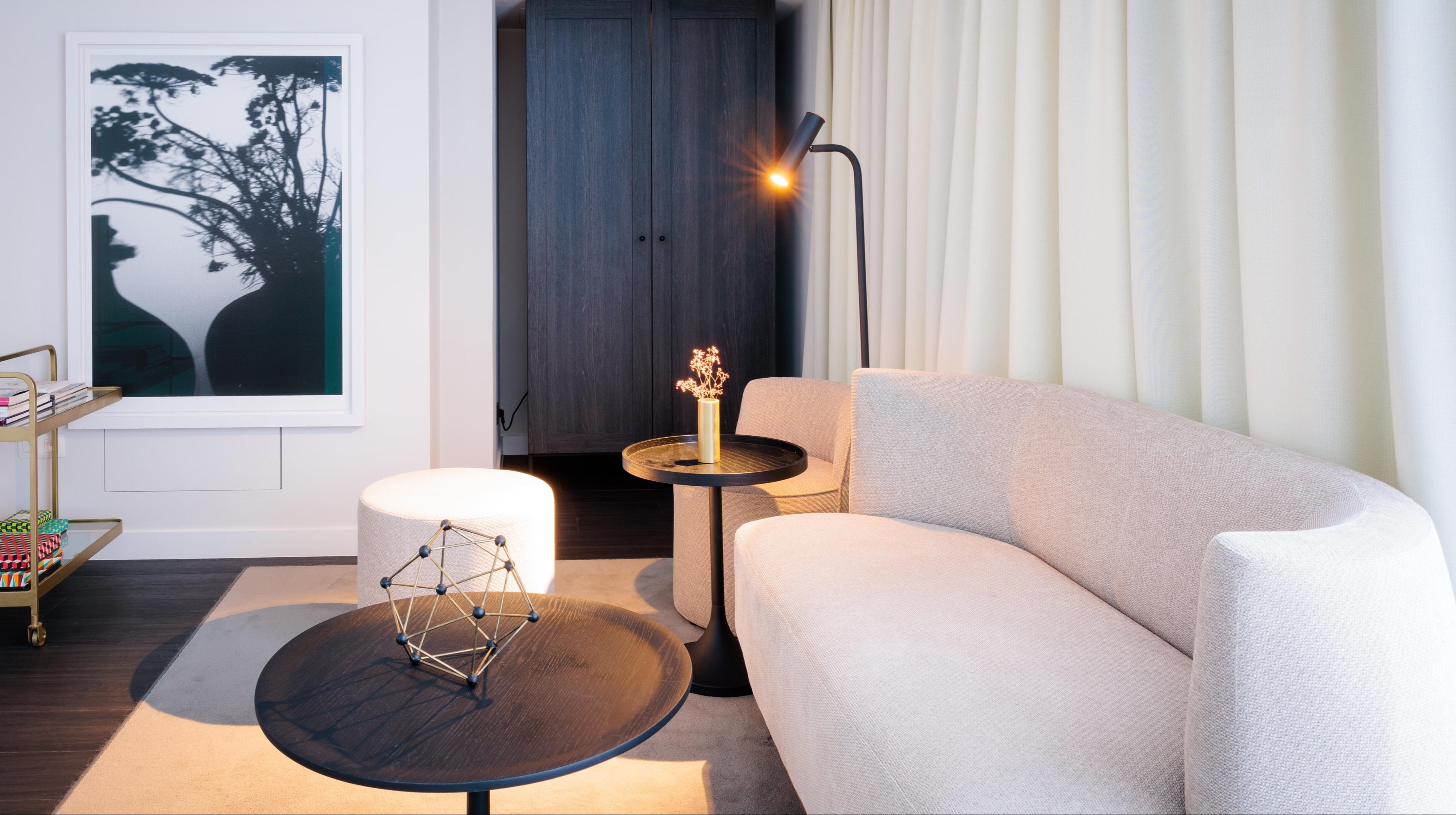 In de kamers ligt de Van Besouw 2609, een karpet met een fluweelzachte velours structuur en subtiele glans. Het verfijnde kleurenpalet sluit naadloos aan op het elegante interieur en draagt bij aan de serene sfeer. Comfort, uitstraling en kwaliteit komen hier samen op de vloer.